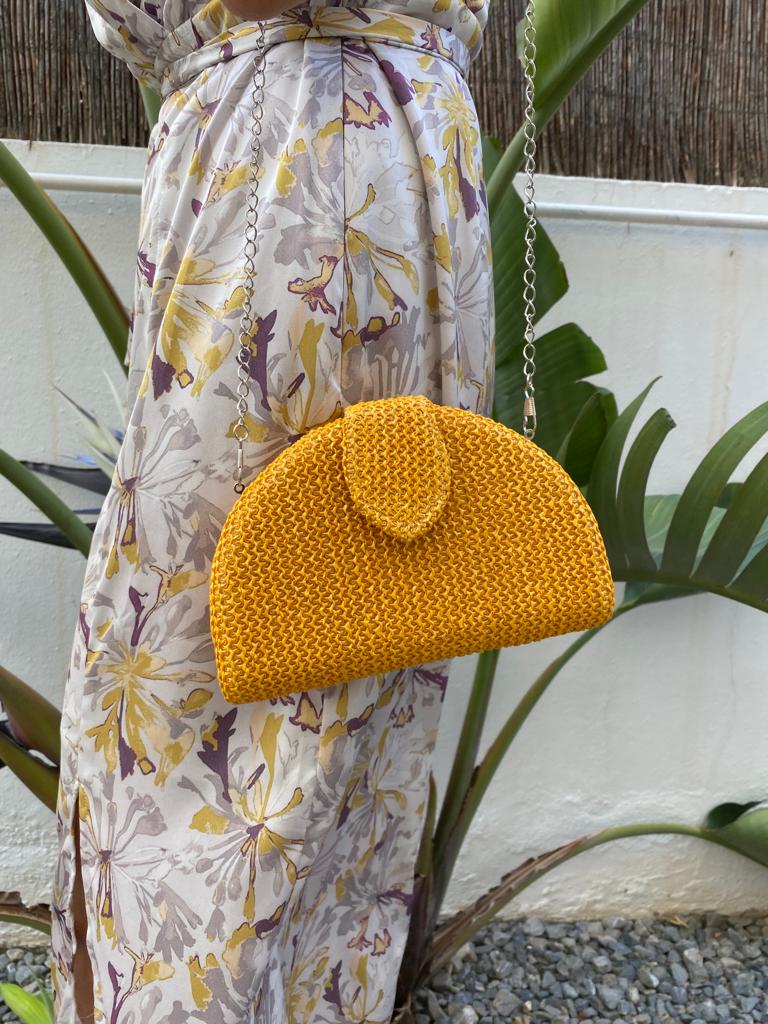 Bolso clutch mostaza, con forma semicurva y cierre click en la parte central.