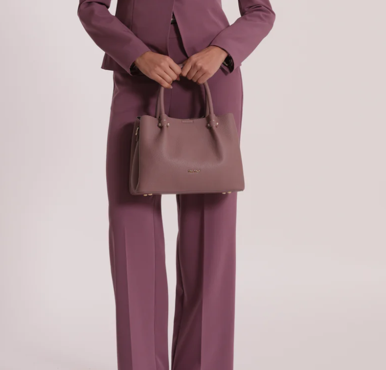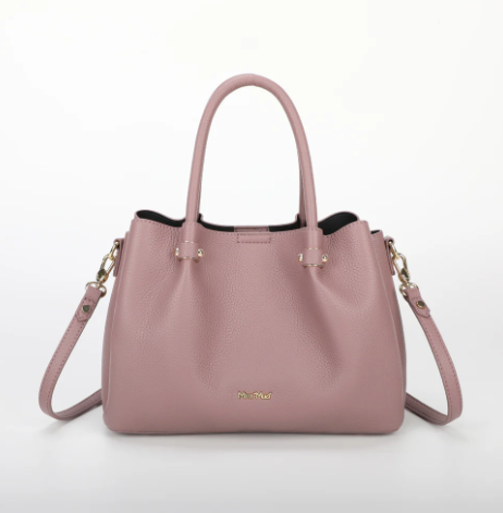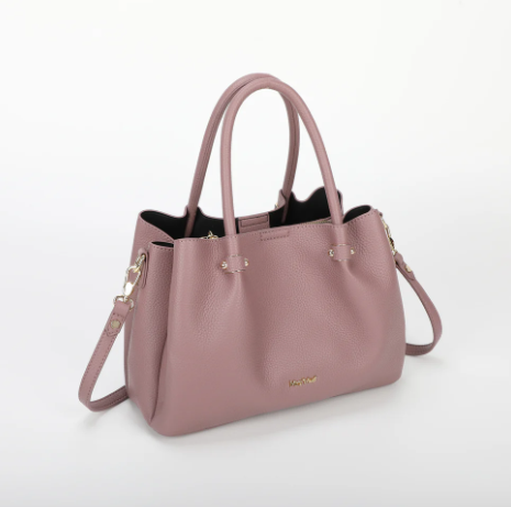 Bolso de mano con tres compartimentos, dos con cierre click y uno central con cremallera, asa larga para bandolera, bolsillo interior.