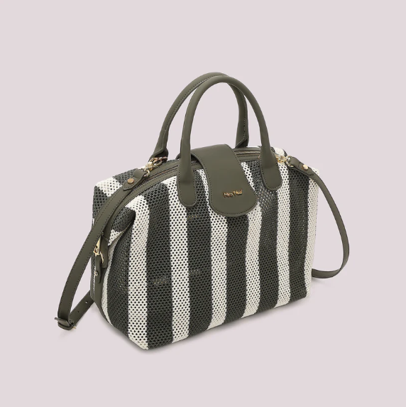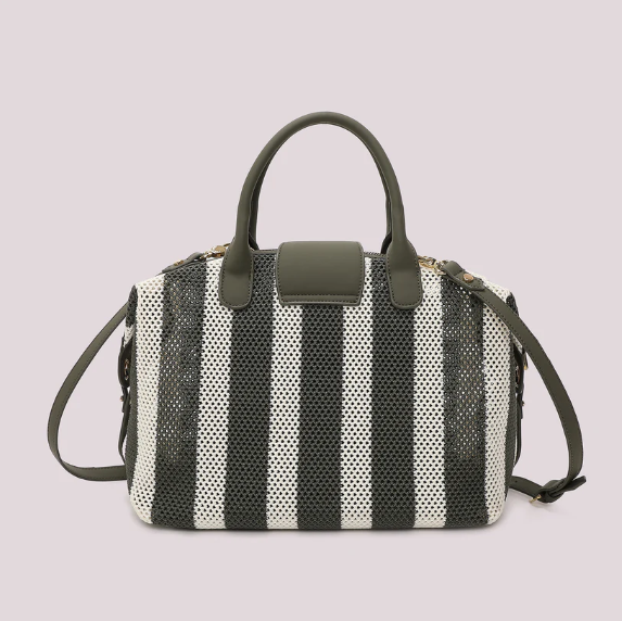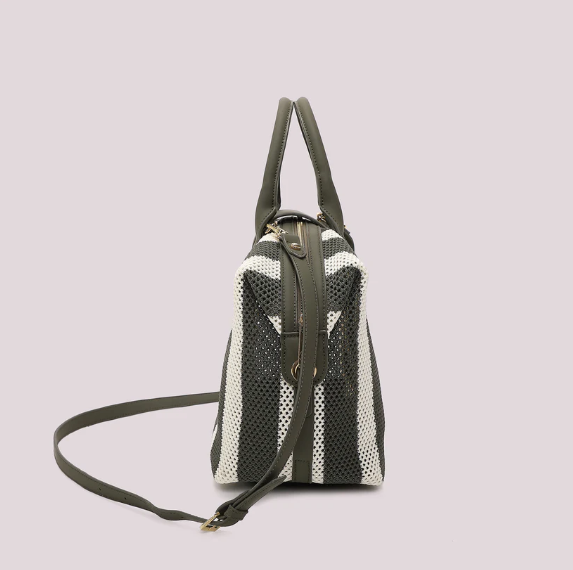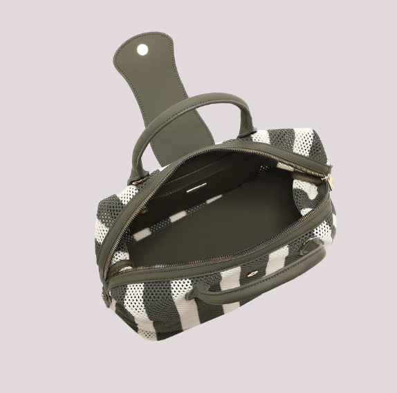 Bolsa baúl Mimi Mua, tejido perforado, doble asa corta y bandolera para colgar, cierre con cremallera y pequeña solapa.