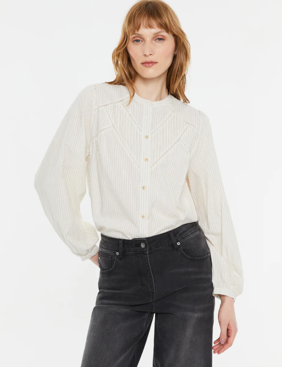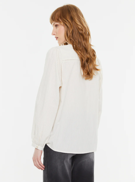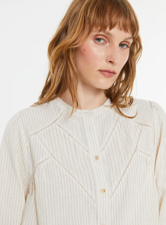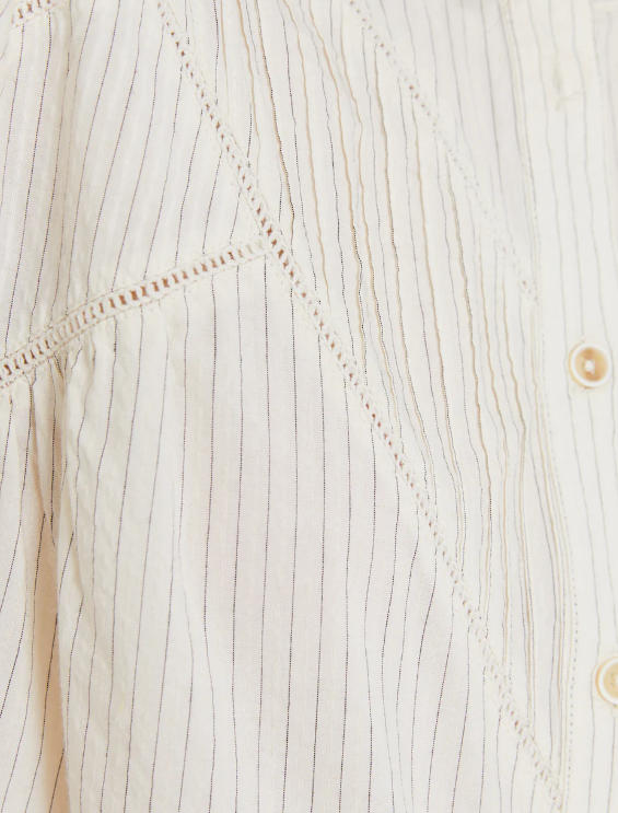 Camisa estampada de rayas, cuello mao y manga larga. Cierre frontal con botones. Detalle de cinta vainica en parte delantera. Regular fit.