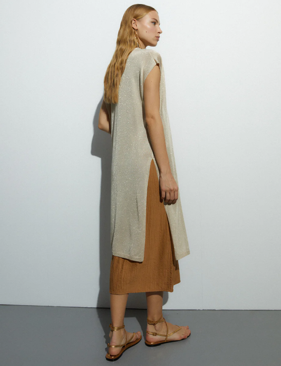 Chaleco largo en punto confeccionado con hilo metalizado dorado. Aberturas laterales. Regular fit.