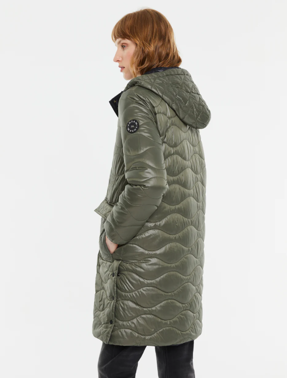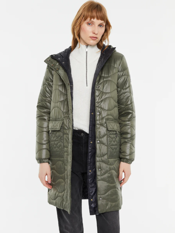 Parka reversible con capucha. Cierre frontal con cremallera y botones a presión. Bolsillos plastrón con tapeta parte kaki y bolsillos tapeta en la negra. Etiqueta logo marca en la manga. Detalle de aberturas laterales con botones metálicos a presión.