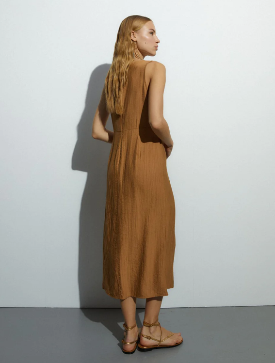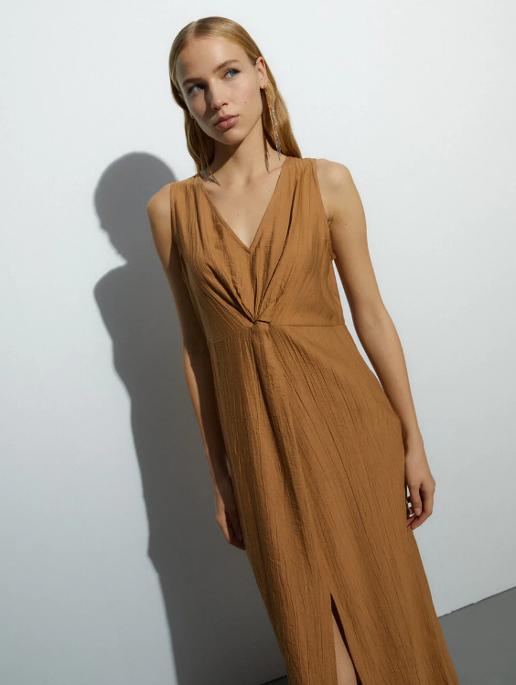 Vestido midi, sin mangas y cuello pico, confeccionado en tejido estrapichato. Cierre con cremallera invisible en espalda. Detalle de nudo central y abertura en el bajo centro del delantero. Es un vestido muy elegante y favorecedor. Regular fit.